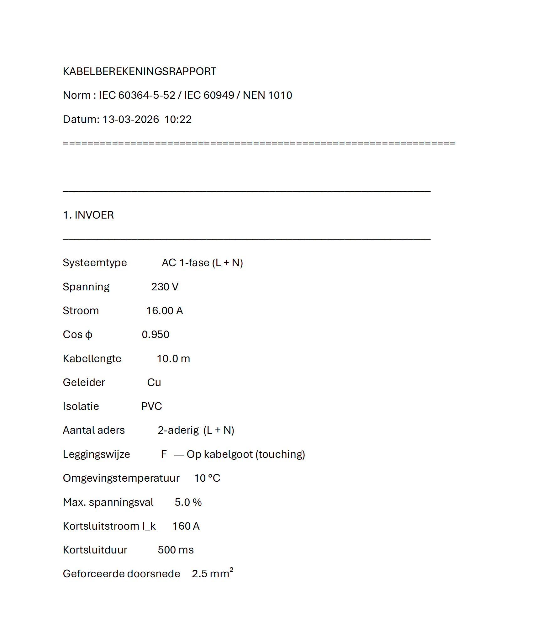 De resultaten worden overzichtelijk gepresenteerd in een professioneel rapport dat direct gebruikt kan worden voor documentatie, controle of projectdossiers. Op basis van de berekende waarden geeft het programma bovendien een duidelijk oordeel over de geschiktheid van de gekozen kabel voor de opgegeven toepassing.
